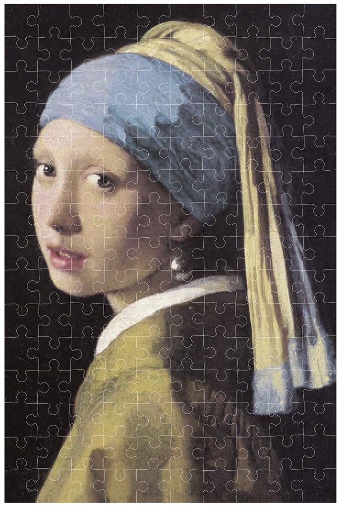 A superb poetic illustration and a real challenge for your mind. Micropuzzle featuring oil painting Girl with a Pearl Earring (1665) by Johannes Vermeer