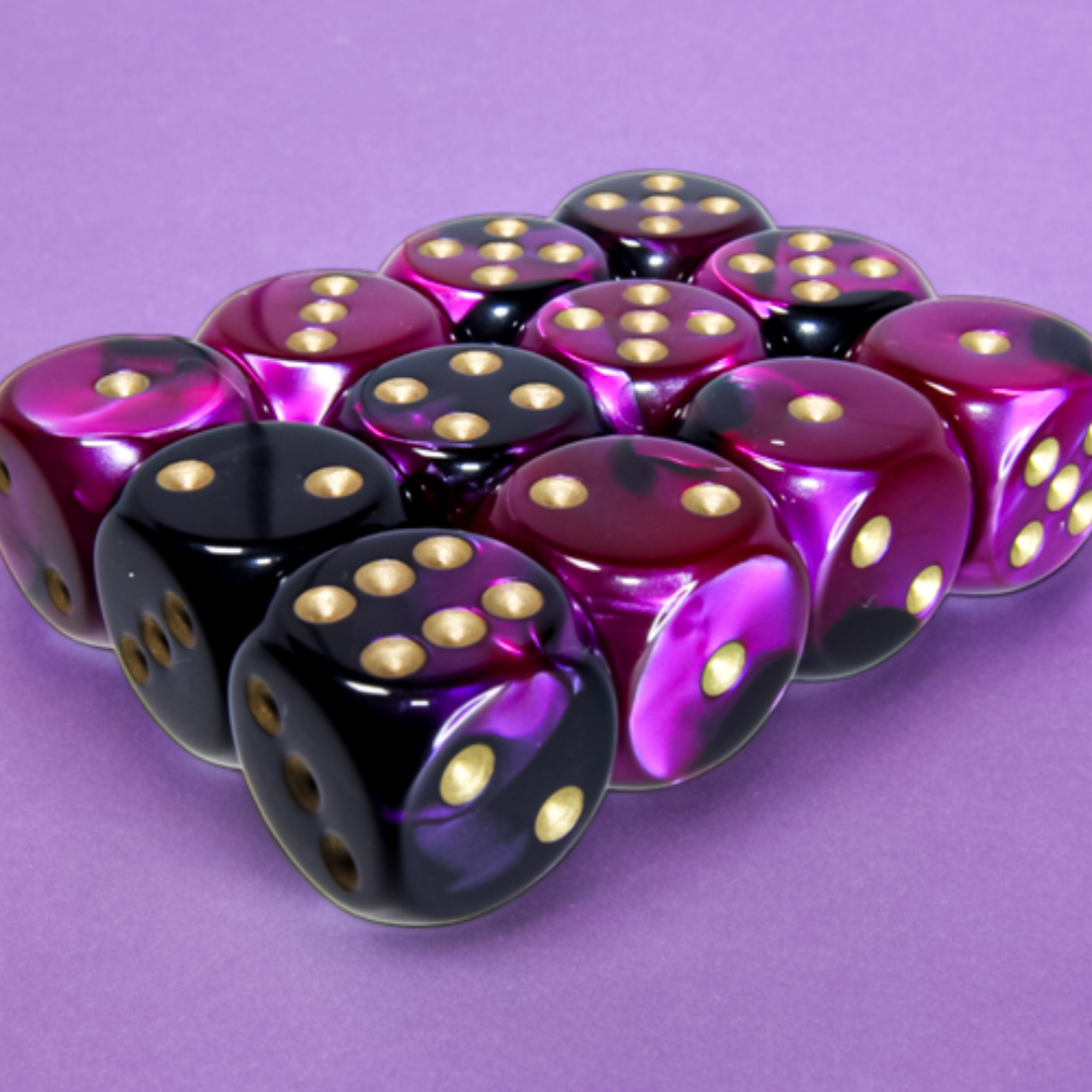 Chessex 16mm d6 dice set, 12pk - gemini: black & purple w/ gold - blacklight reactive!