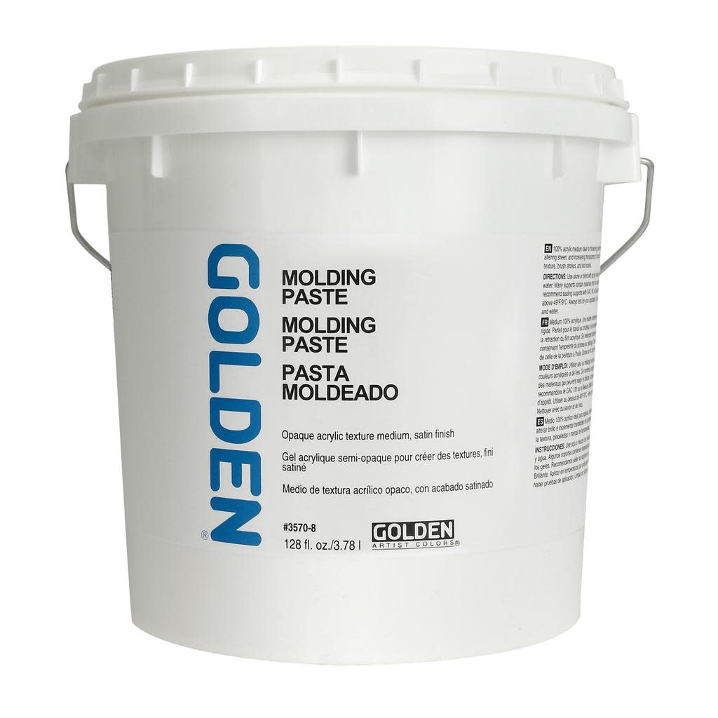 GOLDEN Molding Pastes are opaque products that can be used to create textural surfaces. Manipulation can be done while wet, or after the paste has dried. Molding Paste and Hard Molding Paste can be sanded, carved by hand or with power tools, while Extra Heavy Molding Paste and Light Molding Paste are useful for creating highly textured, impasto techniques.